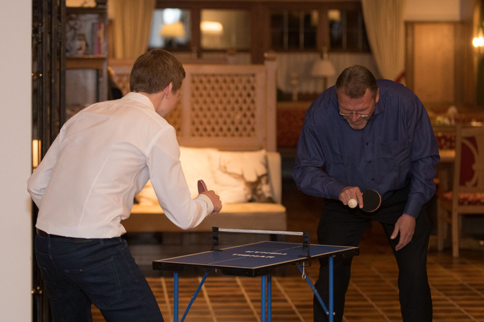 Nach Beendigung des Turniers ging es ziemlich schnell weiter zum Gala-Dinner. Wie schon vergangenes Jahr haben wir uns vorher noch auf meinem Hotelzimmer getroffen und bereits da "vorsichtig" angestoßen :-). Das Gala-Dinner war dann einschließlich der Siegerehrung wieder mal hervorragend organisiert und bot fünf Gänge super-leckeres und toll präsentiertes Essen. Nach dem Dessert ging es dann an die so heiß ersehnte Hotelbar :-P. Auch dort war dann wieder ordentlich was geboten: Auf dem TV-Bildschirm konnte man Fotos vom Turnier bestaunen, man führte nette Gespräche mit den anderen Finalisten, ihren Begleitungen, den Sponsoren sowie den BTTV-Vertretern und wir lieferten uns auch einige "heiße" Duelle am aufgestellten Mini-Tisch. Was mich „wurmt“: Hier habe ich meine einzige Niederlage des Tages kassiert, 6:11 nach 6:0-Führung gegen BTTV-Geschäftsführer Carsten Matthias :-(.