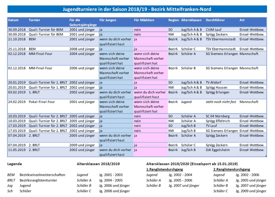 Außerdem enthält die Übersicht auch die Zuordnung der Jahrgänge zu den Altersklassen. Die Einzel-Turniere ab Januar 2019 beinhalten dann eine Verschiebung der Geburtsjahrgänge in den Altersklassen, da die Einzelsportsaison bereits ab dem 15.01.2019 beginnt und alle ab diesem Zeitpunkt weiterführenden Einzel-Wettbewerbe bereits der Saison 2019/2020 zuzuordnen sind. Im Frühjahr starten die ersten Stufen der Ranglistendurchgänge, wobei im 2. Durchgang auch immer die niedrigere Altersklasse in der jeweils älteren teilnehmen darf. Die Altersklasse Schüler C ist eine zusätzliche Altersklasse. Schüler C sind immer auch bei Schüler B-Konkurrenzen teilnahmeberechtigt, weshalb die B-Schüler-Turniere immer terminlich von den C-Schüler-Veranstaltungen getrennt sind.