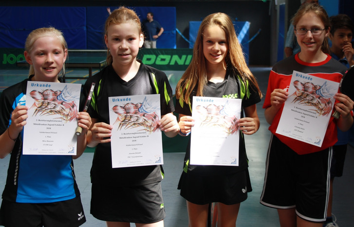 Bei den Schülern B sicherte sich Philipp Seim vom TSV Kornburg denkbar knapp den Turniersieg vor Jakob Weber (TV Hilpoltstein) und Janis Koon Koon (Post SV Nürnberg). Die drei spielten jeweils ein Ergebnis von 4:1. Jakob und Philipp haben sogar die gleiche Differenz von gewonnen und verlorenen Sätzen aufgewiesen, jedoch verlor Philipp einen Satz weniger als Jakob, was am Ende den Ausschlag gab. Bei den Schülerinnen B sicherte sich Mira Hanstein vom CVJM Lauf den Sieg. Hier ging es sogar noch knapper zu, da Mira und Antonia Heindel vom TSC Neudettelsau beide 13:6 Sätze bei 4:1 Spielen aufwiesen und somit ging es auf Ballebene.