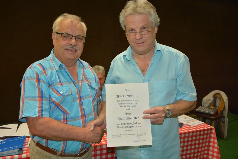 Mit einer angenehmen Aufgabe nahm der neu gewählte Bezirksvorsitzende Günter Bauer seine Arbeit auf. Etwas überrascht wirkte dabei der ehemalige Sportwart und stellvertretende Vorsitzendes des alten Bezirkes Oberpfalz Paul Münster, der unter dem Beifall der anwesenden Bezirkstagsmitglieder zum Ehrenmitglied des Bezirkes Oberpfalz Nord ernannt wurde.