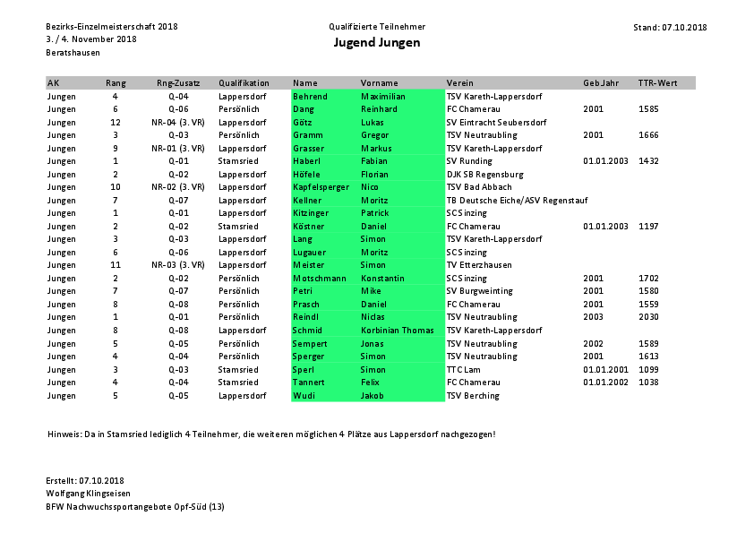 Im weiteren Text und in der Anlage findet Ihr die Liste der Qualifizierten. Im Übrigen ist es auch das Qualifikations-Turnier zur Verbandsbereich-Einzelmeisterschaft der Jugend 2018, das am 17./18 November ebenfalls in Beratzhausen durchgeführt wird.