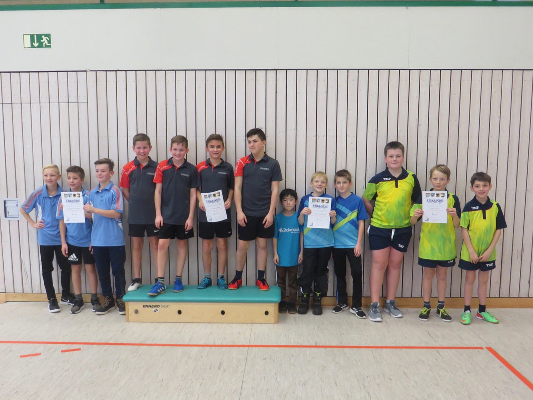 Ebenso klar wurde die Konkurrenz der B-Schüler von den Untereuerheimern dominiert. Sie gaben auf dem Weg zum Titel nur sechs Spiele an die Gegner ab, eines an Gänheim, zwei an Burglauer und drei an Bad Königshofen, und zwar allesamt an Kazuto Itagaki. Der beste B-Schüler des Turniers gab seinerseits in neun Spielen nur fünf Sätze ab, davon gleich drei an Jakob Henkel vom Heimatverein Burglauer, der ihm die einzige Einzelniederlage beifügte. Eine punktgenaue Landung legten Burglauer und Bad Königshofen hin. Nicht nur dass sie sich im direkten Vergleich mit einem Remis neutralisierten, in der Gesamtbilanz lagen sie nach Punkten und Spieldifferenz gleichauf. Den Ausschlag für die endgültige Platzierung gab das Satzverhältnis. Burglauer hatte einen einzigen Satz mehr gewonnen und belegte den 2. Platz vor Bad Königshofen. Ebenso abgeschlagen hinten wie Untereuerheim dominant vorne lagen die Jungen der DJK Gänheim, die in drei Partien insgesamt nur acht Spielpunkte holen konnten.
