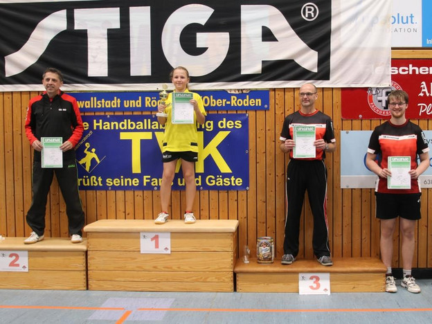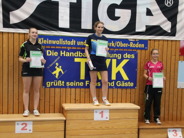 Fünf Damen aller Klassen spielten in einer Gruppe, in der die B-Spielerin Carla Hein die Spielerin der A-Klasse Tabea Reichert überraschend mit 3:0 (12:10, 11:8, 11:6) bezwingen konnte und letztendlich ungeschlagen Bezirksmeisterin wurde. Mit drei knappen Sätzen (11:9, 11:9, 11:9) entschieden Tabea Reichert und Carla Hein (beide TV Hofstetten) gegen Julia Dittel und Sophie Ott (TV Hofstetten / RV Viktoria Wombach) die Doppelkonkurrenz für sich.