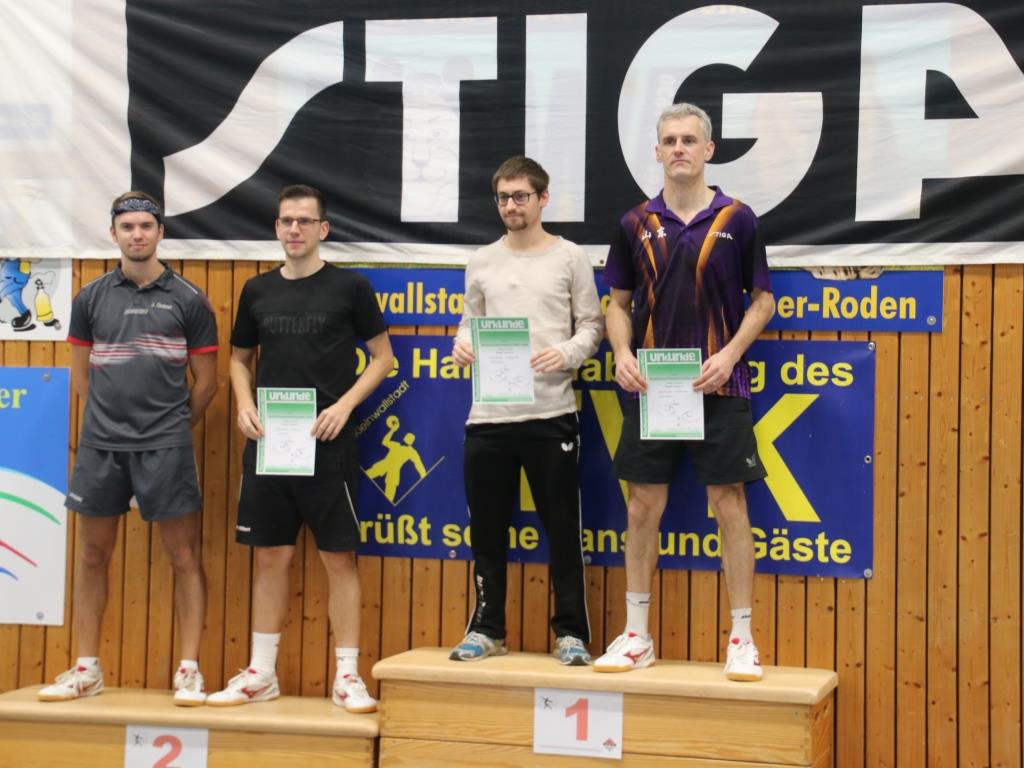Überraschend ist der Sieg des Jugendspielers Lenny Kreis vom TV Hofstetten in der Klasse D-Herren. Er bezwang im Finale Berd Serby vom SV Neuendorf 3:1 (9:11, 11:6, 12:10, 11:4). Das Doppelfinale der D-Klasse entschieden Thomas Breuer und Danil Solodov (SV Albstadt/TSV Alzenau knapp mit 3:2 (4:11, 11:6, 6:11, 11:8, 11:7) gegen Bernd Serby und Rene Lauckner (SV Neuendorf/SV Hörstein) für sich. Die Trostrunde gewann Danil Solodov (TSV Alzenau).
