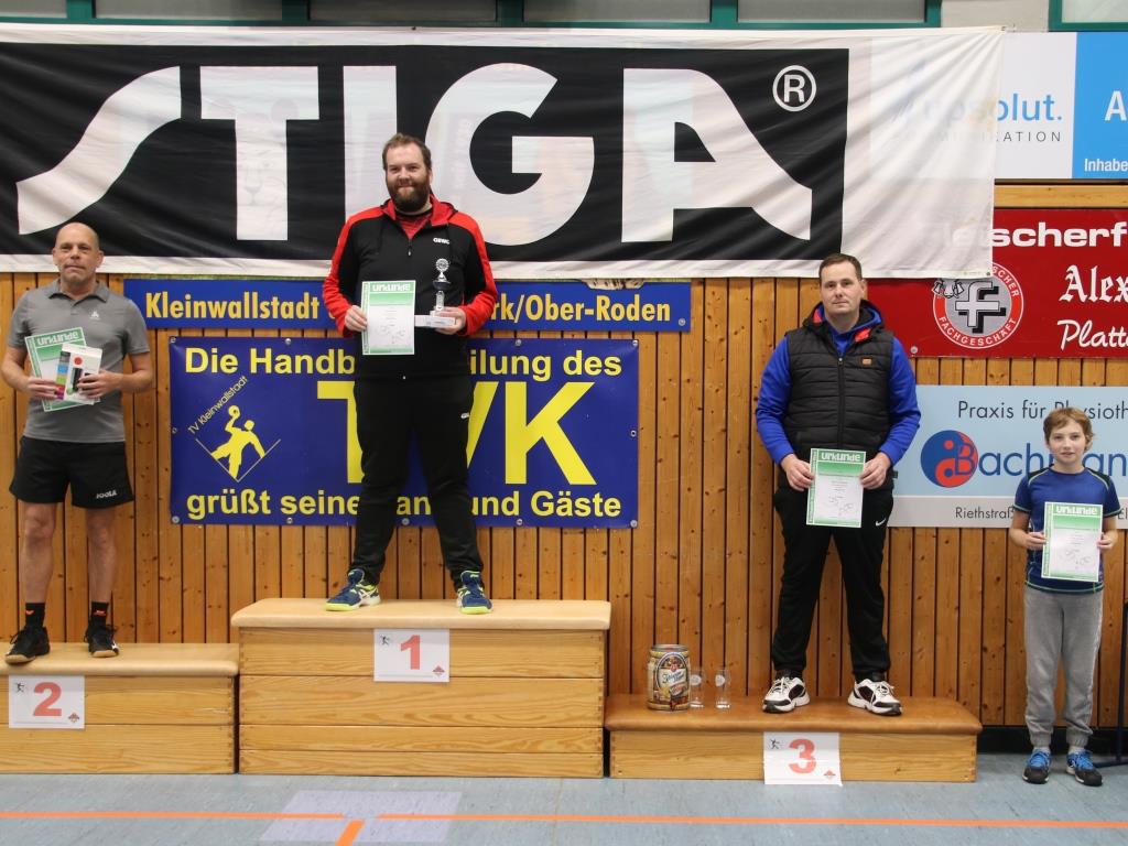 Dreifacher Bezirksmeister 2019 wurde Dr. Ralf Schreiner vom Veranstalter DJK Kleinwallstadt. In einem Endspiel mit vielen schönen Ballwechseln besiegte er Janik Dotzel vom TSV Karlstadt mit 4:1 (11:9,11:2, 11:2, 7:11, 11:4). Auch im Doppel siegte er gemeinsam mit seinem Vereinskameraden Mariam Krämer überlegen über die Doppelpaarung vom TSV Karlstadt, Philipp Kübert / Janik Dotzel mit 3:1 (11:5, 8:11, 11:8, 11:7). Im gemischten Doppel konnte sich Schreiner gemeinsam mit Julia Dittel vom TV Hofstetten mit 3:1 (11:4, 8:11, 11:8, 11:7) den Bezirksmeistertitel gegen Tabea Reichert / Mariam Krämer (TV Hofstetten / DJK Kleinwallstadt) erspielen. Den Sieg in der Trostrunde holte sich Hasan Yildiz vom SC Freudenberg.