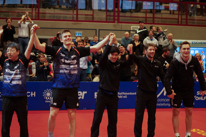 Doch dann regierten der Sport, zwischendurch ein bisschen Karneval und mit zunehmender Dominanz die TSV-Spieler. Die Mannschaft war inspiriert von einer Aussprache am Vorabend und taktisch umgestellt, um dem bisherigen (Angst-)Gegner aus dem Weg zu gehen, wenn der nicht auch umstellt: Lehren aus dem Hinspiel, die vollumfänglich aufgingen, obwohl die Postler ihren Vize-Europameister Ionescu auf 3 setzten – gegen Kilian Ort. Somit eröffnete Mizuki Oikawa an 1 gegen den 2-er Lubomir Jancarik. Der Punkt musste her, wenn die Rechnung aufgehen sollte. Der Japaner mit Turbostart, 9:2 und 11:6 im ersten Satz. Wow! Doch im zweiten stellten sie sportliche Augenhöhe her trotz 45 Zentimeter Unterschied an Körpergröße – 10:12, Satzausgleich. Im dritten Durchgang die gleich-enge Kiste, 11:7 Oikawa. Das Spiel lebte von der Taktik und der Spannung, Weltklasse-Ballwechsel nicht ausgeschlossen.
