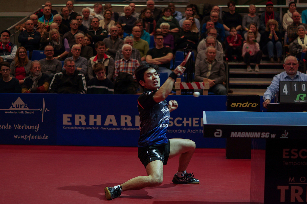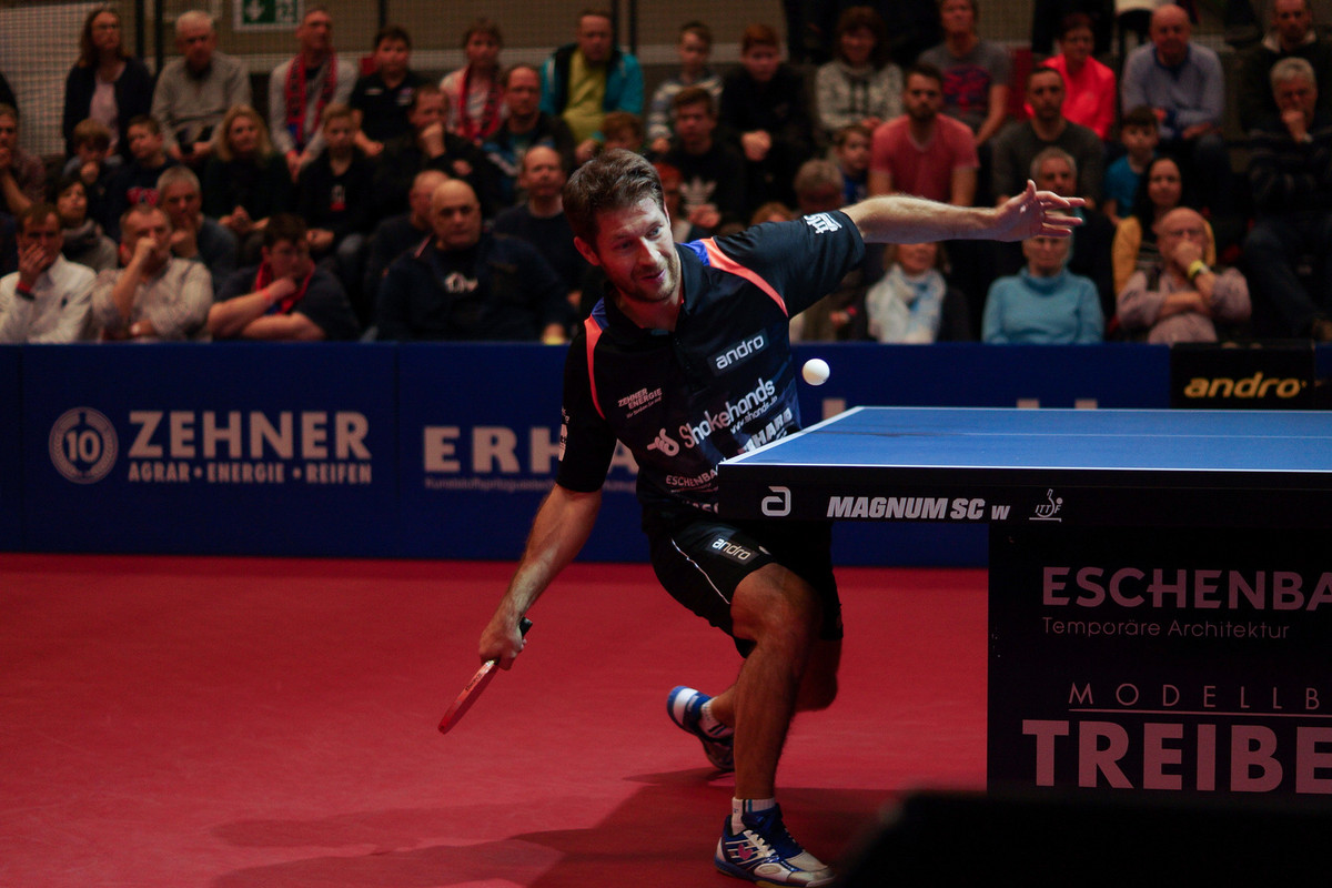 Und das zweite folgte durch einen sensationell kurzen 16-Minuten-3:0-Sieg von Bastian Steger gegen den zweimaligen Doppel-Europameister Daniel Habesohn, Nummer 31 der Weltrangliste. Doch was der TSV-Leitwolf diesmal inszenierte, hatte man in dieser Schnelligkeit und Überlegenheit von ihm und wahrscheinlich auch in dieser Halle noch nie gesehen. Das war absolute Weltklasse des „Basti fantasti“, so der Hallensprecher, dem einfach alles gelang bei dieser 11:4-11:5-11:3-Abfuhr, und Habesohn einfach nichts, wie er es auch anpackte. Ein Basti in eigener Halle vor diesem euphorisierten Publikum, das ist halt doch etwas Anderes als in Budapest oder Katar, wo er heute hin fliegt, irgendwo an Tisch 16, mit drei, die aufmerksam zuschauen, Schiedsrichter und zwei Coaches.