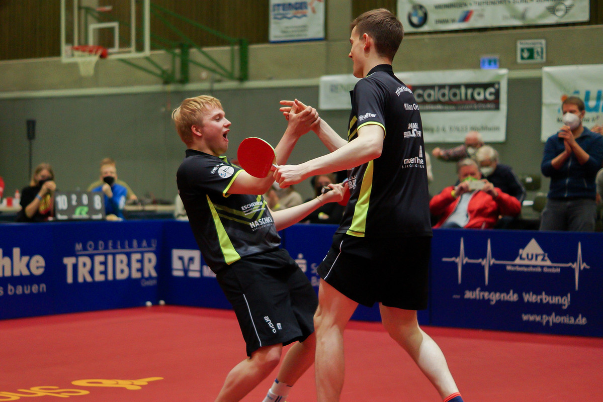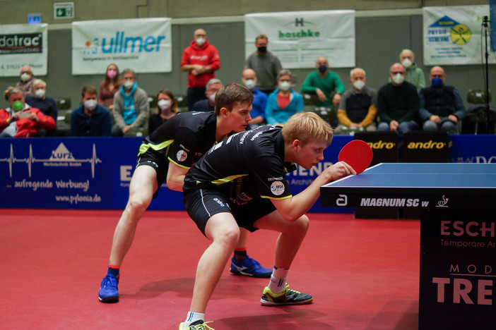 Immer obenauf waren bis über die dritte Stunde hinaus Ort/Grebnev im Entscheidungsdoppel gegen Jorgic/Thakkar. Wobei Jorgic immer noch an den mentalen Folgen seiner Schlappe gegen Ort zu knabbern hatte und nicht der erwartete Leader im Saar-Duo war. Während Ort immer noch lichterloh brannte, als habe er die Betriebstemperatur von seinem Einzel eins zu eins mit herüber genommen. Und an seiner Seite hangelte sich „Maxi“ Grebnev ebenbürtig hoch, immerhin amtierender U21- und Herren-Europameister im Doppel, zum 11:4/11:8/11:8 und beide versetzten die Fans in Verzückung.