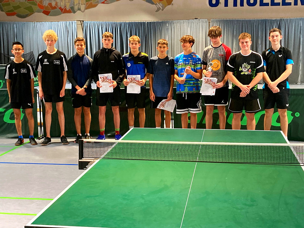 Unter den 13 Startern stießen Jakob Erhardt und Benedikt Spindler mit ungefährdeten Siegen in der Vor- und Hauptrunde bis ins Finale vor. Hier lieferten sich beide ein Match auf des Messer Schneide. Letztlich behielt Erhardt mit 11:8 im Entscheidungssatz die Oberhand. Auch im Doppel setzte sich Erhardt mit seinem Partner durch. Bei der Paarung um den dritten Platz im Einzel blieb Moritz Müller gegen Oskar Fiedler ohne Satzverlust.