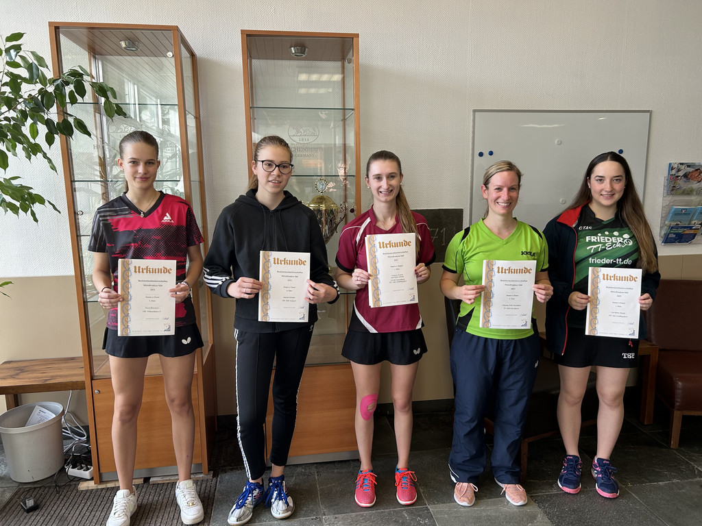 Als Bezirksmeisterinnen qualifizierten sich hier in der Damen B-Klasse Yaren Rosenauer (TTC 70 Bruckberg e.V.) sowie in der Damen C-Klasse Antonia Heindel (TSV 1860 Ansbach) für die bayerischen Meisterschaften.