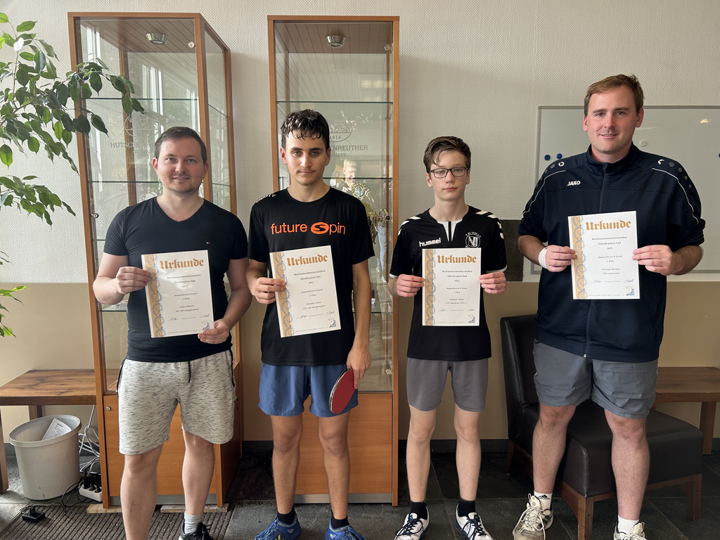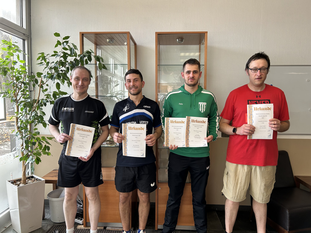 Im Doppelfinale der Herren B-Klasse konnte Felix Biller (TSV Georgensgmünd) seinen Erfolg vom letzten Jahr mit seinem neuen Partner Michael Schüller (TSV Wolkersdorf) fortsetzen, sie setzten sich im Finale gegen Noah Heidemann und Stefan Winter (TV 1879 Hilpoltstein / ESV Treuchtlingen 1883 e.V.) durch.