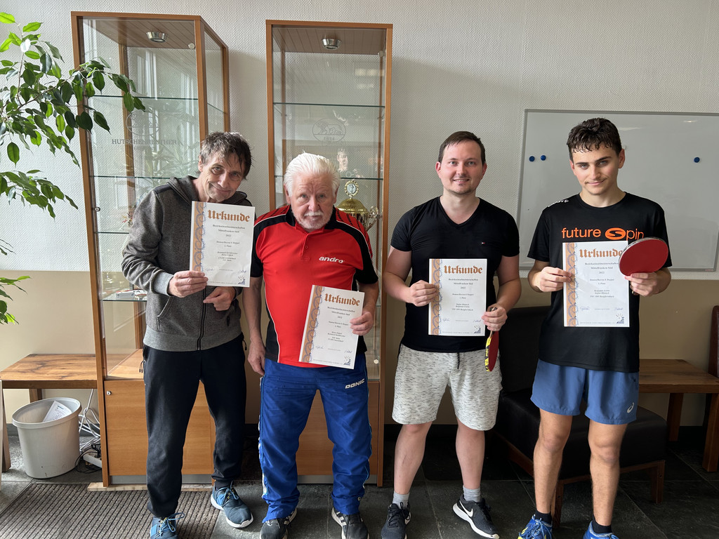 In der Herren E-Klasse gab es ebenfalls einige Generationenduelle. Im Einzel setzte sich am Ende die Jugend durch, es siegte in einem spannenden Finale Johannes Christl (1. FC Heilsbronn 1920 e.V.) gegen Benjamin Estrin (TSV 1895 Burgfarrnbach). Im Doppel schafften es die Ü70er Reinhard Steinbrecher (CVJM Unterasbach) und Horst Zeipelt (TSV Stein) ins Finale, mussten sich dort allerdings den Burgfarrnbachern Benjamin Estrin und Stefan Hänisch geschlagen geben.