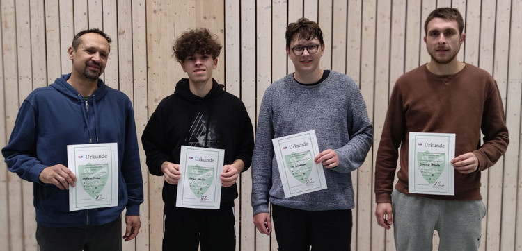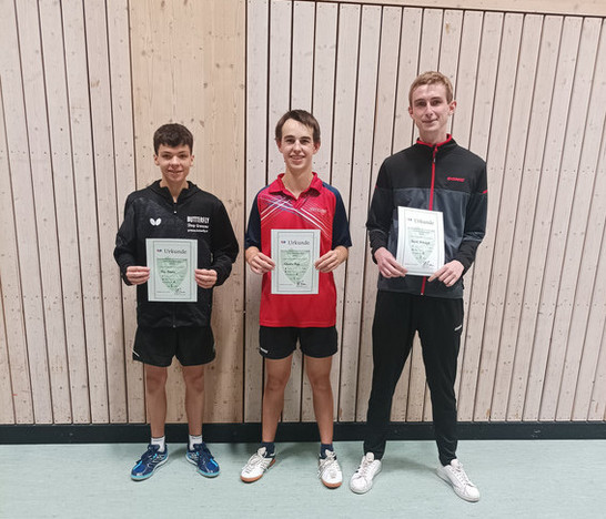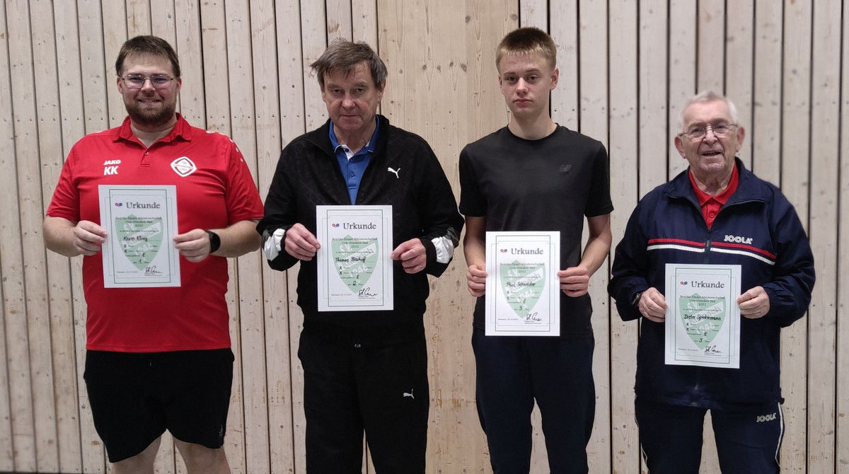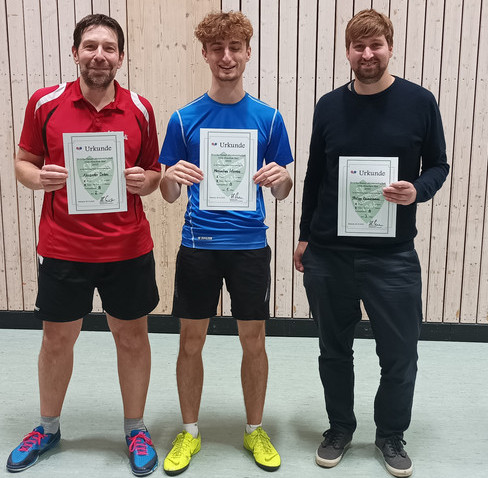 Ohne Niederlage setzte sich Celestin Popp (SB Versbach) bei den Herren A durch. Bei nur fünf Teilnehmern wurde eine Runde „jeder gegen jeden“ gespielt. Dabei gab Popp bei vier Siegen nur einen einzigen Satz (4:0-Spiele; 12:1-Sätze) ab. Auf Rang zwei landete Finn Braunz (TSG Waldbüttelbrunn; 3:1/9:4) vor Daniel Niemczyk (SB Versbach; 2:2/7:10), Johannes Weimann (TV Dettelbach; 1:3/5:10) und André Scheer (SB Versbach; 0:4/4:12).