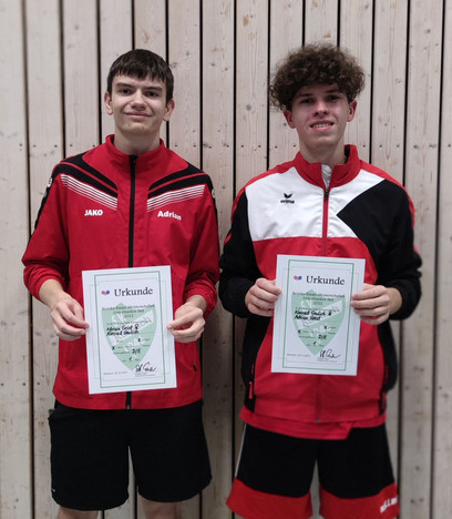 Auch die Doppelkonkurrenzen mussten zusammengelegt werden: In der Klasse A/B/C feierte Maximilian Interwies seinen zweiten Bezirkstitel zusammen mit seinem Waldbüttelbrunner Vereinskollegen Finn Braunz. Sie siegten mit Finale gegen das Duo vom TV Dettelbach, Sebastian Falkenstein und Johannes Weimann, mit 3:1 (13:11, 11:6, 9:11, 11:7). Im Finale standen übrigens ein B-Spieler (Interwies) und ein C-Spieler (Falkenstein), während das topgesetzte Paar Popp (1. im Einzel) und Niemczyk (3. im Einzel) im Finale nur noch Zuschauer war.