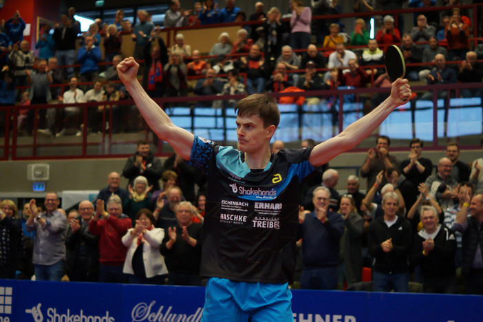 Das Spitzeneinzel dieses Spitzenspiels bestritten somit zwei der derzeit besten Spieler der Liga, Kilian Ort gegen Simon Gauzy. Bereits im ersten Satz weckte „Killy“ Hoffnungen, die er hinterher auch erfüllen konnte – 11:8. Im zweiten Durchgang schien der Königshöfer Leader alle taktischen Fesseln ab- und seinen Spielplan über den Haufen werfen zu wollen. Es kam nämlich zu sensationellen Ballwechseln, bei denen jede Mathematik und Geometrie außer Kraft gesetzt wurde. Der Preis: zunächst 8:11 gegen Ort. Doch er hatte sich dabei in so einen Rausch gespielt, sich immer häufiger, auch bei unspektakulär aussehenden Bällen, mit „gut“ gepusht, dass er diesen mit 11:4 und den vierten mit 11:9 für sich und sein Team entschied.