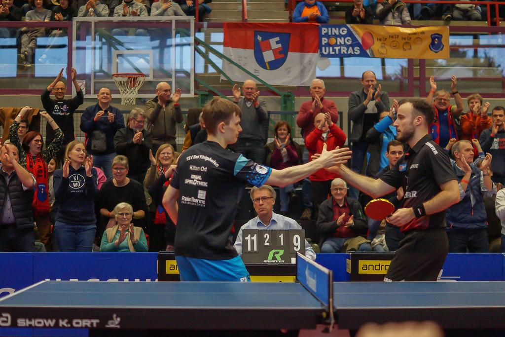 Die großen Fische im Tischtennis-Bundesliga-Teich sind in dieser Saison die Leibspeise des TSV Bad Königshofen. Nur an den TTF Liebherr Ochsenhausen haben sich die Grabfelder zum elften Mal im dreizehnten Vergleich verschluckt: Nach den Niederlagen in der Liga und im Pokal in der Vorrunde gab es diesen Sonntag eine knappe 2:3-Heimniederlage, durch ein 2:3 im Entscheidungsdoppel. „Ich bin nicht traurig“, gestand der TSV-Manager Andy Albert hinterher im Bamberger-Talk. „Sieger war heute die Sportart, und ich bin stolz auf unsere Jungs. Sie haben den Zuschauern dreieinhalb Stunden Tischtennis auf Weltklasse-Niveau geboten.“