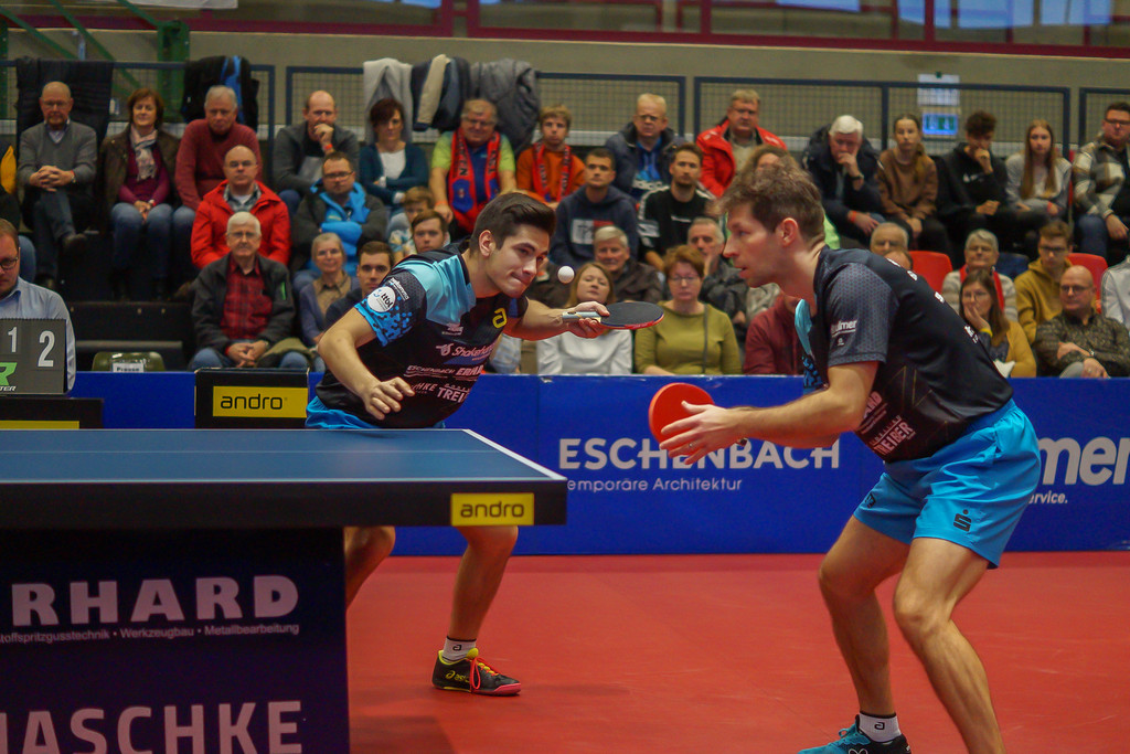 Wobei er vielleicht Kilian Ort beim TSV und Alvaro Robles bei den TTF hätte herausheben können, weil Ort zwei Einzelsiege beitrug und Robles eineinhalb Punkte im Einzel und im Doppel. Der Lokalmatador Kilian Ort, Erfolgsgarant beim Sensationssieg in Düsseldorf, besorgte seiner Mannschaft die 1:0-Führung, weil er so nebenbei erfolgreich Revanche an dem jungen Polen Samuel Kulczycki nahm, dem er beim letzten Vergleich unterlegen war. Deshalb und im ersten Satz war nachzuvollziehen, warum die Gäste ihn dem Franzosen Akkuzu vorgezogen hatten. Er gewann ihn, ehe Kilian Ort auf Betriebstemperatur war. Doch dann setzte sich Ort mit seiner speziellen Taktik der Kurz-Kurz-Spiel-Vorbereitung seiner Angriffe durch. Es war ein hartes Brot, das er erst weich kauen musste.