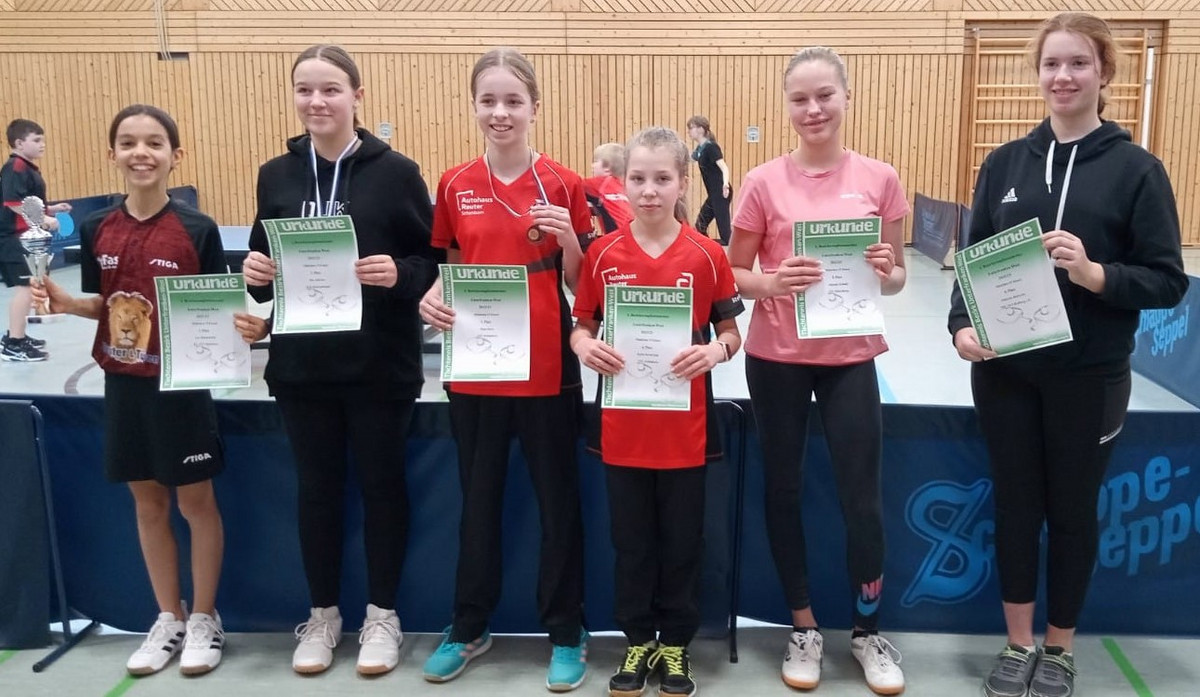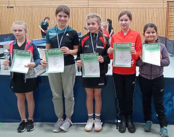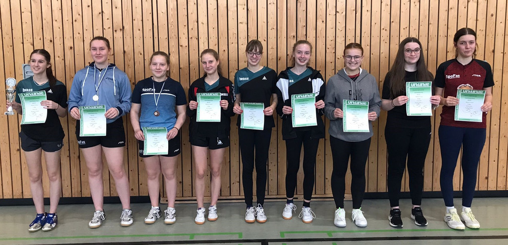 Lea Blumentritt (TV Hofstetten) gewann ungeschlagen mit 5:0 Siegen die Mädchen 15. Mia Jülicher (DJK Kleinwallstadt) und Maja Stein (TTC Schimborn) folgten auf den Podestplätzen zwei und drei.