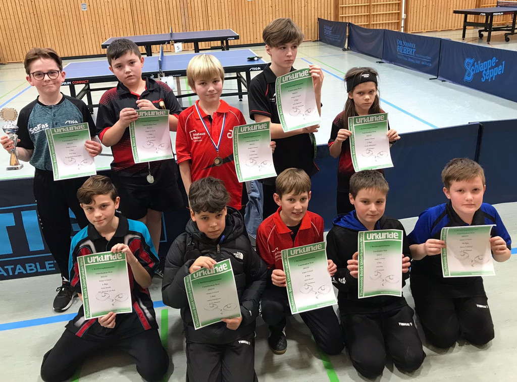 Bei den Jungen 13 setzte sich Felix Zang (TuS Aschaffenburg-Damm) mit 9:0 Siegen und 27:0 Sätzen sehr souverän durch. Platz 2 ging mit 7:2 Siegen an Moritz Frerichs (TV Dettingen). Spielgleich mit nur zwei siegreichen Sätzen weniger landete Leopold Uttner (TTC Schimborn) auf dem dritten Rang.