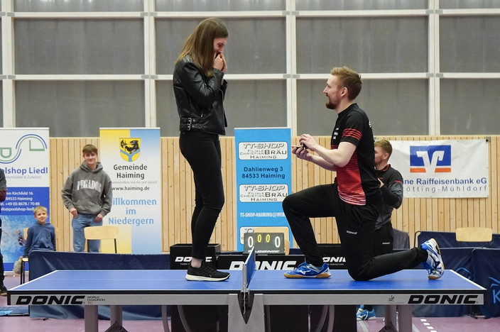 Der absolute Höhepunkt war jedoch sein Heiratsantrag an seine langjährige Freundin Simone auf dem vorderen Spieltisch, den sie unter dem Jubel und vieler Tränen der Zuschauer annahm. Daraufhin startete eine ausgelassene Feier, die in Haiming noch lange in Erinnerung bleiben wird.