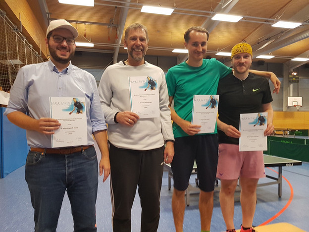 quittieren. Doch von dieser Pleite erholte sich Wingerter recht schnell und leitete mit einem 11:3, 11:7 und 11:8 die Wende ein. Die beiden dritten Ränge gingen an Ralf Franke (Post-SV Bamberg) und Christian Gahn (TTC Lettenreuth). Die beiden Finalgegner bildeten ein Doppel und wurden ihrer Favoritenrolle gerecht. Mit 11:8, 11:6 und 11:7 gaben sich Wingerter und Petrick keine Blöße gegen das Duo Timo Mittelberger/Rainer Bezold (RVB Schorkendorf).