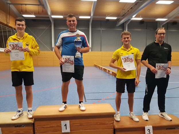In vier Gruppen ermittelten 18 Herren die besten Acht für die Endrunde. Nachdem Philipp Weiß (TTC Tüschnitz) bereits in seinen vier Gruppenspielen nicht bezwungen werden konnte, marschierte er auch in der Finalrunde bis ins Endspiel vor. Hier musste er gegen Jannis Baudler (TV Wiesenfeld) vor allem in den Durchgängen eins und zwei auf der Hut sein, blieb letztlich aber ohne Satzverlust (11:9, 11:9, 11:7). Weiß hatte im Halbfinale Jason Klinner (TV Coburg-Lützelbuch) mit 3:1-Sätzen und Baudler ebenfalls mit 3:1 Jonas Jacobi (TSV Unterlauter) ausgeschaltet.