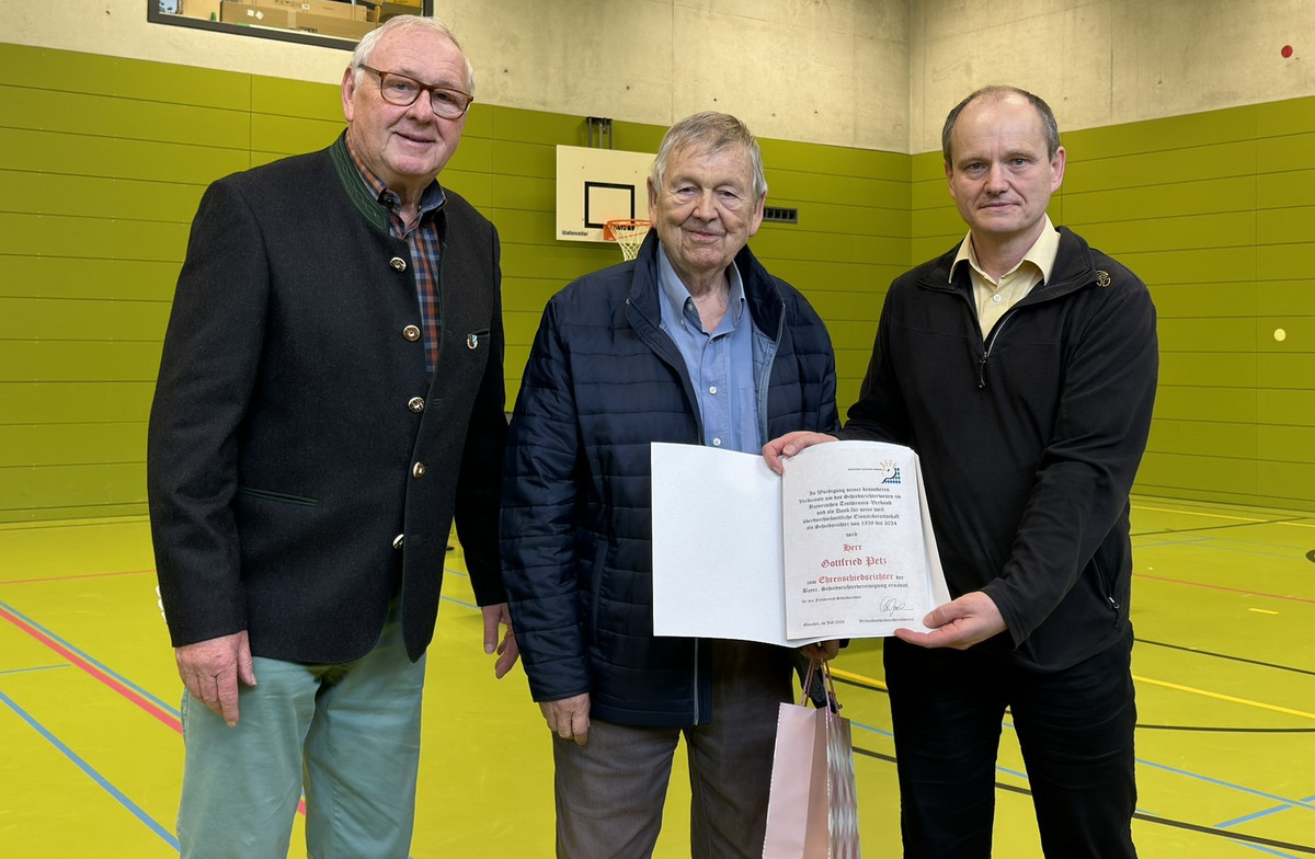 Auf dem Bild sehen wir Gottfried, wie er vom Nationalen Schiedsrichter Tino Arlt in Begleitung des Bezirksvorsitzenden Rudi Prösl die Urkunde als Ehrenschiedsrichter überreicht bekommt. Rudi Prösl hat Gottfried für seine ehrenamtlichen Leistungen als Fachwart in verschiedenen Ämtern des Bezirkes Oberpfalz mit der Ehrennadel des Bezirkes ausgezeichnet.