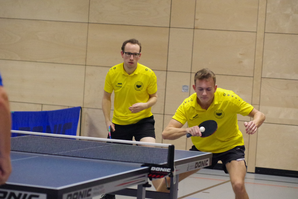 Wie eng es zum Auftakt zuging, zeigt, dass die beiden Doppel und die ersten zwei Einzel über die volle Distanz von fünf Sätzen gingen. Zwar konnte die Formation Joel Fischer/Manuel Bojer nach 1:2-Rückstand mit einem 11:8 und 11:7 das Ruder noch herumreißen, doch das Duo David Fischer/Yannick Rauscher brachte die 2:1-Führung nicht ins Ziel. Auch im ersten Tageseinzel lag Joel Fischer mit 2:1 vorne, doch zum Sieg reichte es gegen die heimische Nummer eins nicht. Nicht belohnt wurde in einem auf hohem Niveau stehendem „Monsterduell“ die Aufholjagd von David Fischer gegen den überaus starken Reichart. Nach diesem 1:3-Rückstand war es Yannick Rauscher, der den Verlust seines ersten Durchgangs (11:13) gegen Baumgärtel schnell wegsteckte und mit einem 11:7, 11:9 und 11.4 auf 2:3 verkürzte. Da sich Manuel Bojer nach vier Sätzen beugen musste, war es David Fischer, der mit seinem Sieg gegen Spitzenspieler Enter zum zwischenzeitlichen 3:4 die Hausherren zunächst nicht davoneilen ließ. Doch von da an war bei den Gästen der Faden gerissen, denn nun gingen die drei restlichen Einzel an den Throninhaber.