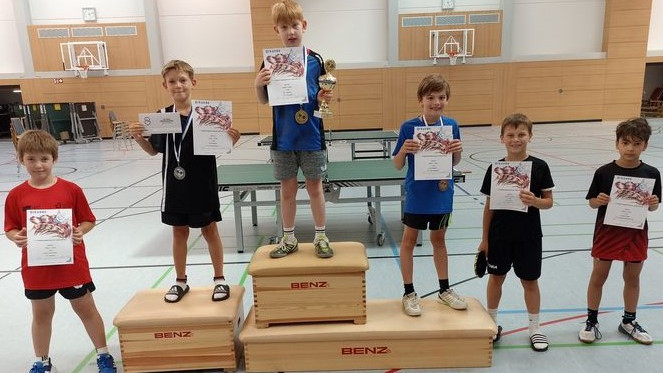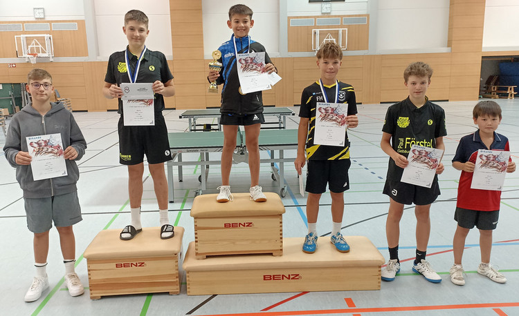 Unter den 14 Startern in der AK 11 kam Karl Lungkwitz in seiner Gruppe zunächst nicht ungeschoren davon. Bei der einzigen Niederlage in seinen sechs absolvierten Begegnungen lang er zwar gegen Finn Hartmann (SV Altensittenbach) nach Sätzen mit 2:1 vorne, zog aber noch mit 2:3 den Kürzeren. Doch diese Niederlage beeindruckte das Talent aus dem Gemeindeteil von Bad Staffelstein in der Endrunde überhaupt nicht. Er blieb hier ungeschlagen und lag am Ende mit seinem harten Widersacher Hartmann sowie Noah Hoffmann (TSV Bad Königshofen) jeweils mit 6:1 Spielen gleichauf vorne. Dass es so weit kam, hatte seinen Grund darin, weil Hoffmann gegen Hartmann gewann und Lungkwitz gegen Hoffmann die erste Geige spielte (11:8, 11:7, 11:6). Letztlich musste das Satzverhältnis herangezogen werden und dieses sprach für Lungkwitz (20:5), so dass er Hartmann (19:8) und Hoffmann (18:7) auf den zweiten und dritten Rang verwies. In der gleich Alterskategorie war noch Theo Kalb vom TSV Scherneck mit von der Partie. Er wurde in seiner Siebener-Gruppe Fünfter (mit 3:3-Spielen lag er mit dem Rangdritten gleichauf). Nach der Trostrunde stand der 10. Platz für ihn zu Buche.