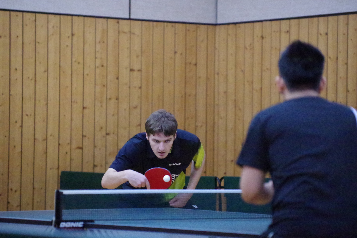 Die Gäste traten zwar mit zwei Ersatzspielern an, hatten aber ihre Nummer eins und zwei aufgeboten. Für die Hauherren war erstmals als neue Nummer zwei Dimitar Stoimenov im Einsatz. Er bildete zusammen mit Trifon Lengerov das vordere Paarkreuz. Beide gewannen gemeinsam ihr Doppel und ihre jeweils zwei Einzel. Während dabei Lengerov ohne Satzverlust blieb, musste Stoimenov im Treffen mit Hannes Andritzky nach dem 1:2-Satzrückstand zwar bangen, doch mit einem 11:2 und 11:9 legte er den Hebel noch um. Paul Hofmann der auf Position drei zurückrutschte machte mit seinen zwei Gegnern kurzen Prozess. Kai Müller musste gegen die gleichen Akteure nur einen unbedeutenden Satz abgeben.