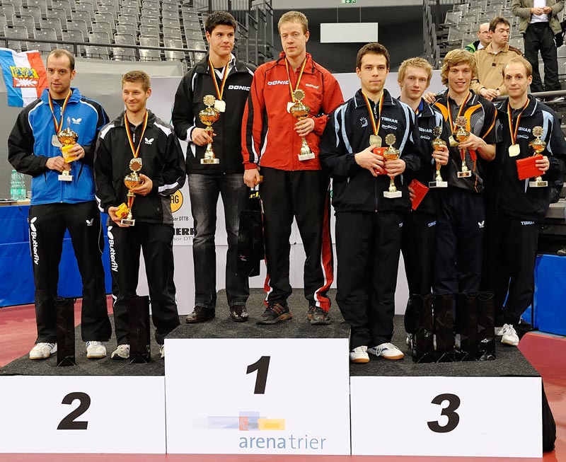 Die beiden Herren-Doppel mit bayerischer Beteiligung gewannen in Trier jeweils Bronze. Sowohl Alexander Flemming/Jörg Schlichter (TV Hilpoltstein/TSV Gräfelfing) als auch Nico Christ (TSV Gräfelfing) mit Lennart Wehking waren im Halbfinale ausgeschieden und wurden gemeinsame Dritte. Dabei lieferten die Titelverteidiger Flemming/Schlichter nach den ersten beiden Sätzen, die beide klar verloren, den späteren Meistern Patrick Baum und Dimitrij Ovcharov ein packendes Duell auf Augenhöhe. Am Ende musste sich das bayerische Duo aber mit 1:11, 6:11, 11:5, 11:13, 12:10 und 8:11 geschlagen geben. Keine Chance hatten hingegen Christ/Wehking, die gegen Lars Hielscher und den aus der Oberpfalz stammenden Bastian Steger in vier Durchgängen unterlagen. Allerdings waren beim 9:11, 5:11, 10:12 und 9:11 gleich drei Sätze hart umkämpft. Steger unterlag im Endspiel mit Hielscher gegen Baum/Ovtcharov in sieben spannenden Durchgängen und wurde damit deutscher Vizemeister.