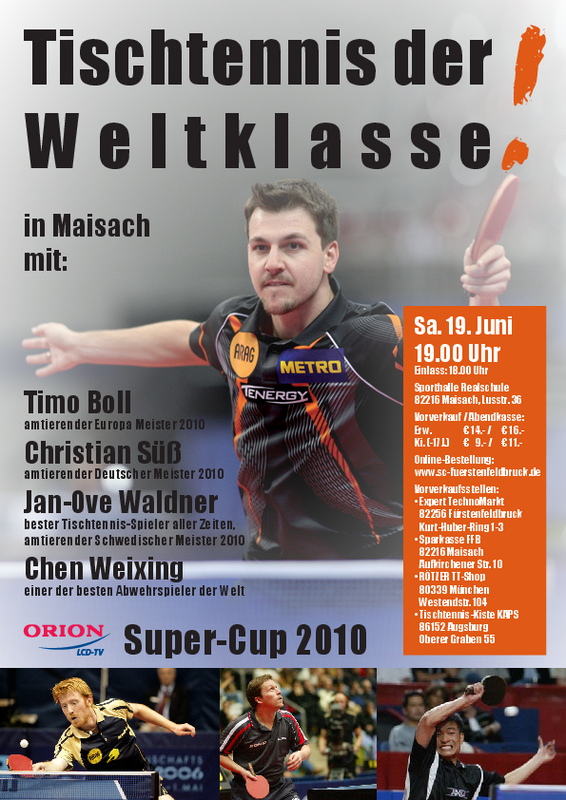 Ein besonderes Schmankerl erwartet die Besucher des Orion-LCD-TV-Super-Cups, der im Rahmen einer deutschlandweiten Turnierserie auch drei Mal in Bayern gastiert: Vier der weltbesten Tischtennisspieler sowie vier regionale Spitzenspieler treffen aufeinander und spielen in Viertelfinale, Halbfinale und Finale (insgesamt somit 7 Turnierspiele) den Turniersieg aus.