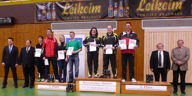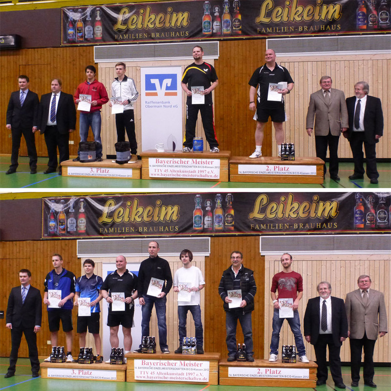 Herren-Einzel und Doppel C: In der Einzel-Konkurrenz der Herren D-Klasse ging der Sieg in die Oberpfalz zu Alexander Birkholz vom SC Regensburg. Er feierte im Endspiel einen 3:1-Erfolg über Werner Brzoska (SV Schlossberg-Stephanskirchen, OBB). Bronze gewannen Marco Zirkel (TTC Creussen, OFR) sowie Hüseyin Akbulut (SV 1873 Nürnberg Süd, MFR). Im Doppel erklommen Markus Baumgärner/Sebastian Blum (MBB Manching/TSV Dachau, OBB) das oberste Siegerpodest.