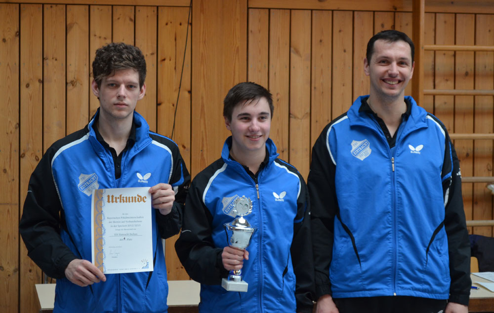 Männer, Viertelfinale: TSV Ottobrunn - TSV Eintr. Eschau 4:5, TSV Ansbach - TTG Straubing 5:3, SV Burgweinting - TTC Rugendorf 1:5, TV Waal - Spvgg Thalkirchen 5:0 (kampflos). - Halbfinale: TTC Rugendorf - TSV Ansbach 1:5, TSV Eintr. Eschau - TV Waal 5:0. - Endspiel: TSV Ansbach - TSV Eintr. Eschau 2:5. - Eschau spielte mit Stefan Stadtmüller, Andreas Schattney und Kevin Spielmann.