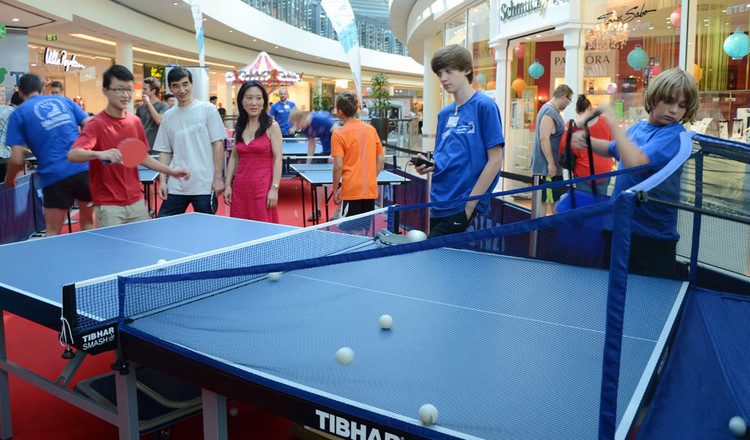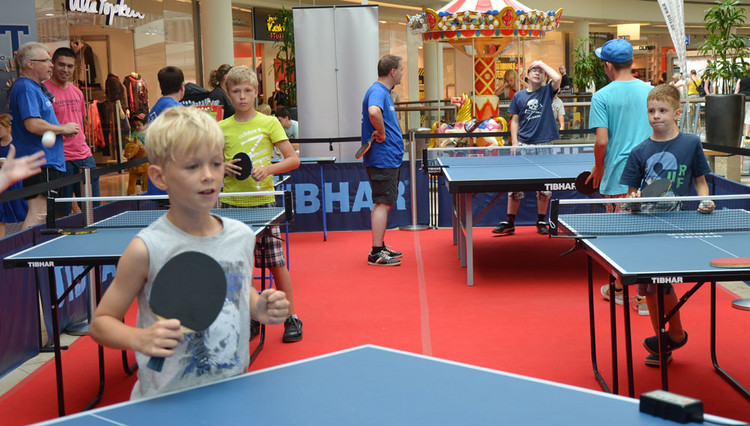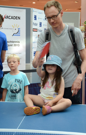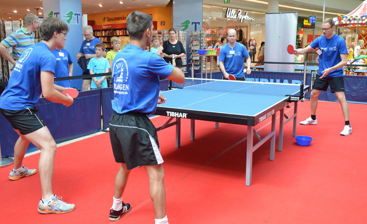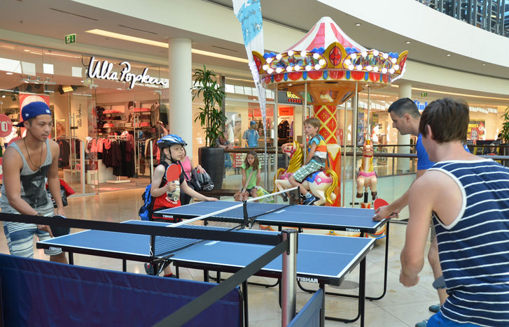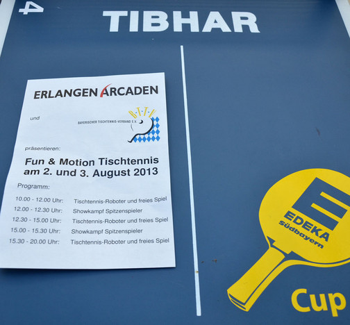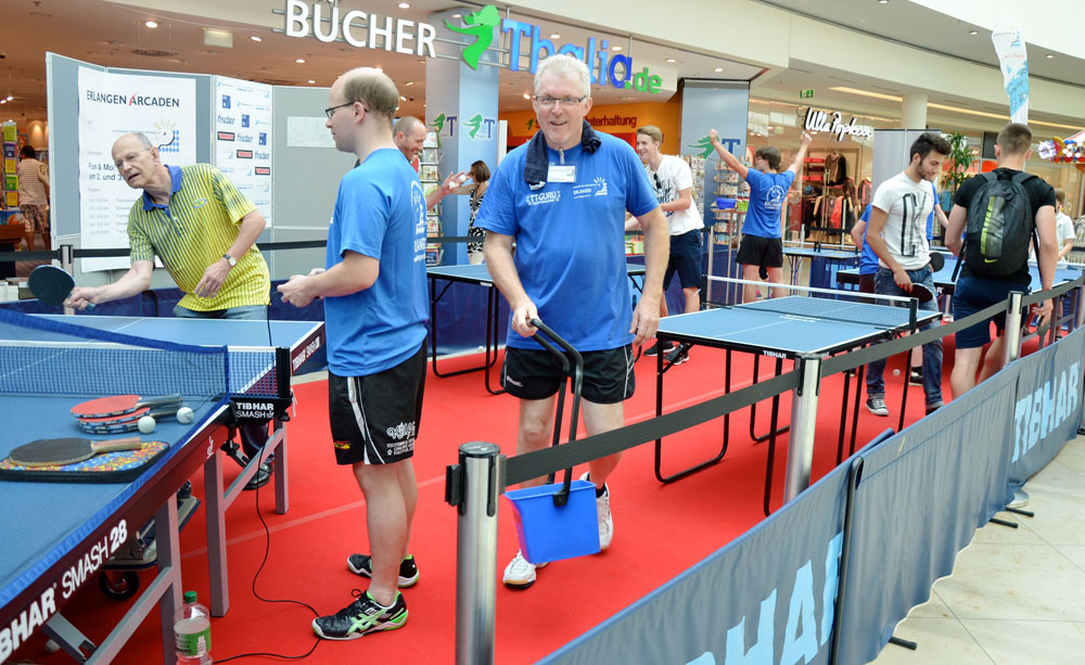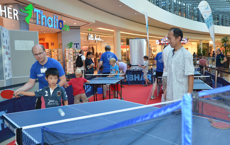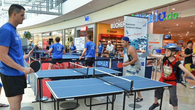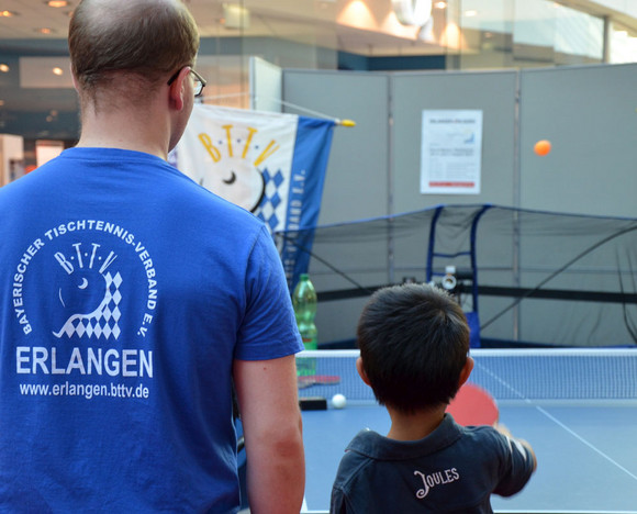 Ganz viel Spaß und Bewegung brachte der Bayerische Tischtennis-Verband vergangenen Freitag und Samstag in die Erlangen Arcaden, das »größte Schaufenster« der Stadt. Abwechslungsreiche Mitmach-Angebote und beeindruckende Showkämpfe zogen die Besucher des Einkaufszentrums in den Bann. »Trotz Saunaklima, bei dem man sogar am Mini-Tisch zum Schwitzen kam, war der Run auf unsere Mini-, Midi- und Wettkampftische wieder einmal richtig groß. Auch dem Center-Management hat`s gefallen, sodass es nächstes Jahr wahrscheinlich eine Neuauflage der Aktion geben wird«, freute sich BTTV-Projektleiterin Petra Scherer. »Lediglich für unsere Schaukämpfe hätten wir uns etwas mehr Zuschauer gewünscht. Da machte sich das Hochsommerwetter doch deutlicher bemerkbar.«
