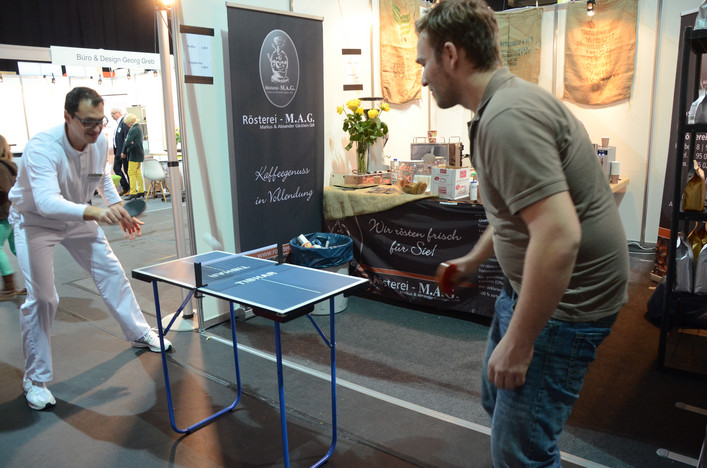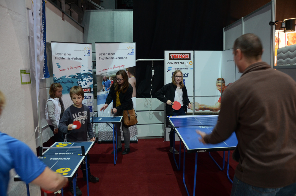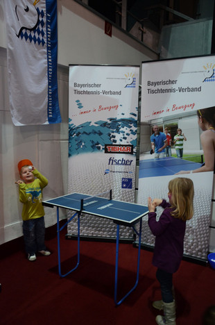 Für einen »ausgewachsenen« Tischtennistisch war der BTTV-Standplatz nicht groß genug, doch das machte überhaupt nichts aus. Im Gegenteil: Die Besucher der Gesundheitsmesse »Franken aktiv und vital«, die vergangenes Wochenende in der Bamberger brose Arena stattfand, waren von den bereitgestellten Mini- und Miditischen regelrecht hingerissen. »Einige hätten am liebsten gleich ein Exemplar mit nach Hause genommen«, berichtet Petra Scherer (Mitarbeiterin der BTTV-Geschäftsstelle), die den Stand zusammen mit Siegfried Prell (Vorsitzender BTTV-Kreis Bamberg) und Georg Koch (TV Hallstadt 1890) betreute.