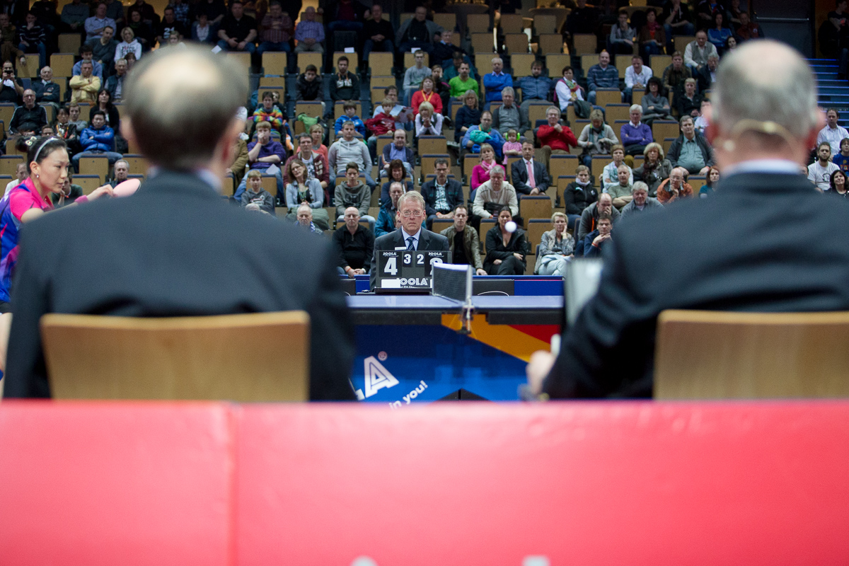 Irre lang dauerten die Ballwechsel, die sich Penholder-Angreiferin Shan und Defensiv-Strategin Han lieferten. So lange, dass auf Cars Geheiß Ende des fünften Satzes die sogenannte Wechselmethode - im Tischtennis-Volksmund meist »Zeitspiel« genannt - einsetzte. »Wenn die Bälle nonstop so oft hin und her fliegen, muss man in geeigneten Momenten schon immer mal wieder bewusst blinzeln, um den Blick frisch zu halten«, verriet Zahel. »Viele unterschätzen wie konzentriert neben den Spielern und Betreuern auch wir Schiedsrichter sein müssen, wie anstrengend so ein Spiel auch für uns ist. In diesem Duell kam erschwerend hinzu, dass es sich bei Siegerin Shan um eine klassische Penholderspielerin handelt, bei der nur eine Seite des Schlägerblattes mit einem zugelassenen Belag versehen ist. Hier gilt es bei jedem ihrer Schläge zusätzlich genau hinzuschauen, ob der Ball auch mit der richtigen Seite getroffen wurde«, ergänzt Car sichtlich erschöpft, aber auch erleichtert. Er und sein Assistent Zahel hatten ihren schwierigen Job toll gemacht.