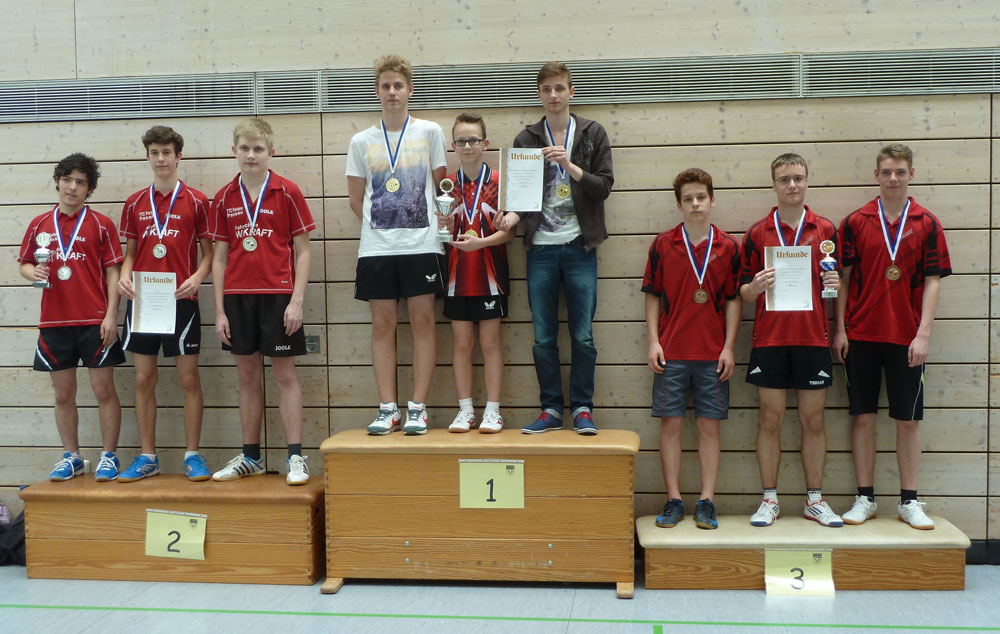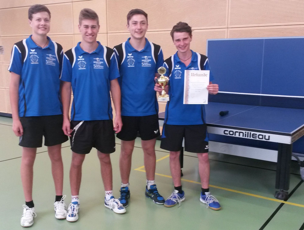 Auch die Finalteilnehmer der Jungen waren sich vor dem Finale bereits in der Vorrunde begegnet, doch im Unterschied zu den Mädchen hatte das Duell beide Male den gleichen Sieger: Der TSV Stein (Daniel Drobietz, Ilja Mazur, Patrick Sipowicz) aus Mittelfranken gab dem TTC Fortuna Passau (Paul Beltechi, Janik Bürgermeister, Alexander Paßberger) in der Gruppe wie im Finale mit 5:2 das Nachsehen. Platz drei feierte der TuS Geretsried durch einen 5:2-Erfolg im kleinen Finale über den TV Waal, dem sie in der Vorrunde noch 3:5 unterlegen waren.