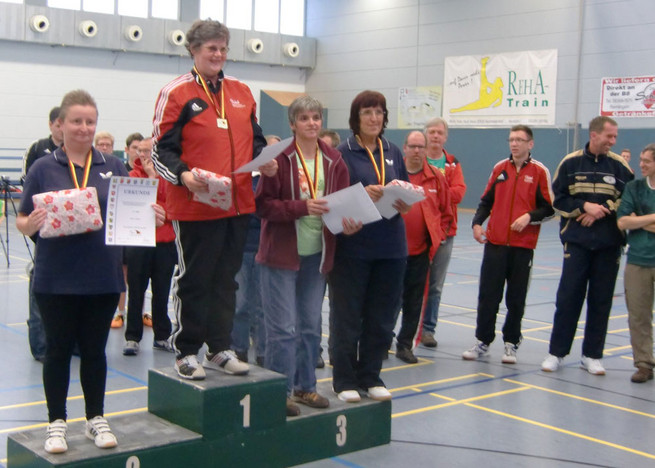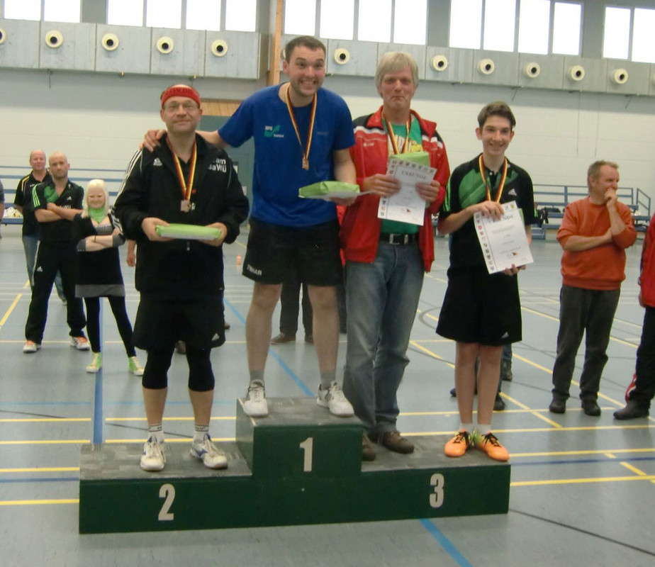 Tobias Thomas neuer Titelträger bei der Deutschen TT-Meisterschaft für Menschen mit geistiger Behinderung in Marktheidenfeld! Am 12./13.9.2014 fand in Marktheidenfeld die 4. Deutsche Tischtennis-Meisterschaft für Menschen mit geistiger Behinderung (Klasse11) statt. Im Jahr 2011 war Marktheidenfeld bereits Ausrichter der 1. Deutschen Meisterschaft. 2013 richtete der RV Viktoria Womach die Meisterschaft aus. Nachdem sich ein anderer Bewerber zurückzog, kam die Anfrage an den TV Marktheidenfeld. Am ersten Tag wurden die Gruppenspiele und die ersten K.o.-Runden im Einzel durchgeführt, am zweiten Tag die Endkämpfe und der Teamwettbewerb. In einem äußerst spannenden Endspiel gewann diesmal Tobias Thomas gegen den Titelverteidiger Hartmut Freund nach 1:2 Rückstand noch mit 3:2. Bernd Schulz errang den dritten Platz. Eine klare Angelegenheit war es bei den Damen. Susanne Quade gewann gegen Miriam Jörgens 3:0. Die Siegerin gab während des gesamten Turniers keinen Satz ab. Dritte wurden Angelika Peters und Thea Hinsberger. Den Teamwettbewerb gewannen Thomas und Freund bei den Herren und bei den Damen Jörgens/Peters im Endspiel gegen Hinsberger/Nikolaus. Der Deutsche Behindertensportverband, vertreten durch die Herren Christian Koppelberg und Karl-Heinz König äußerte sich äußerst positiv über die Helfer des TV Marktheidenfeld unter dem neuen Abteilungsleiter Albin Hoh und seinen Vorgänger Bernhard Laqua. Auch die Bezirksschiedsrichter sorgten für einen rebungslosen Verlauf. Das Lob des TV Marktheidenfeld ging an die Aktiven und ihre hervorragende Fairness. Die Turnierleitung war wie immer in guten Händen bei Robert Förster und Frau Schneller.