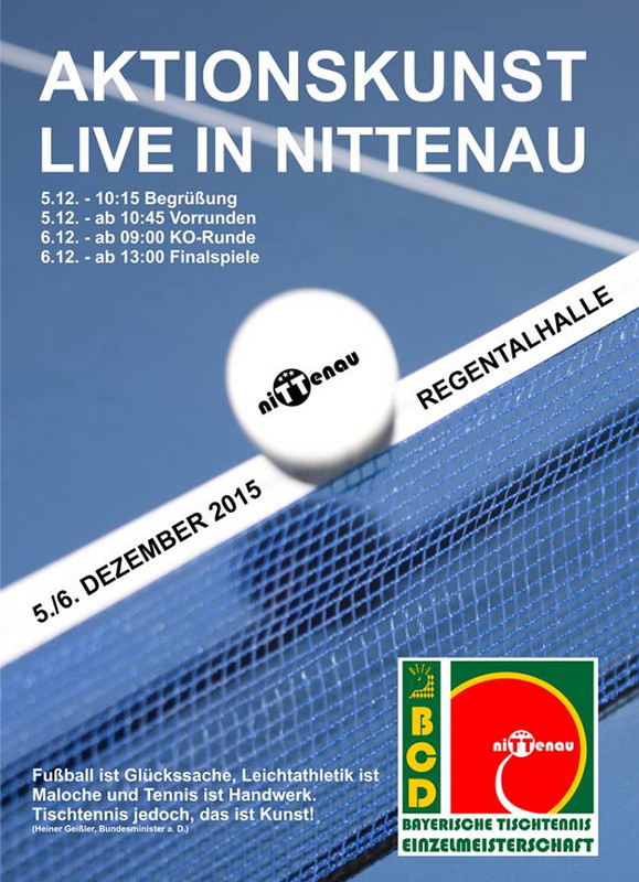 Die Regentalhalle im oberpfälzischen Nittenau ist am kommenden Wochenende (5./6. Dezember) wieder einmal Schauplatz eines großen Tischtennisturniers: Insgesamt 128 Aktive (32 Damen und 96 Herren) wettstreiten bei den 17. Bayerischen Einzelmeisterschaften der Leistungsklassen B, C und D um die Landesmeistertitel der Konkurrenzen Einzel, Doppel und Mixed sowie um die Qualifikation für die Deutschen Meisterschaften der Leistungsklassen am 11./12. Juni 2016 in Pforzheim.