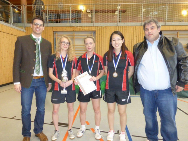 Bei den Damen gingen die Bayernligateams der unterfränkischen RV Viktoria Wombach II (Claudia Edelhäuser, Laura Nätscher, Lisa-Marie Gress) und des schwäbischen TTC Langweid III (Eva Bickel, Barbara Jungbauer, Haike Zhang) als souveräne Gruppensieger hervor und lieferten sich am Sonntag ein Endspiel auf Augenhöhe: Dass die Langweiderinnen in drei von vier Fünfsatzspielen knapp die Nase vorn hatten, machte beim 5:3 den Unterschied zu ihren Gunsten. Platz drei ging an die Mittelfränkinnen vom CVJM Lauf.