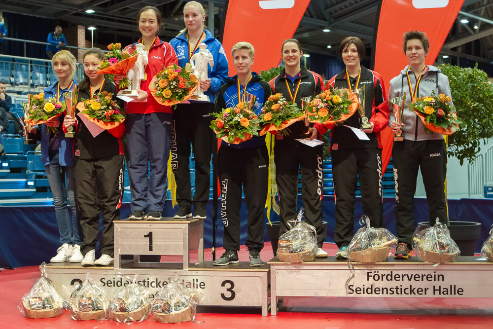 Im Damen-Einzel wurde Kristin Silbereisen zum zweiten Mal nach 2010 Deutsche Einzel-Meisterin. Im stark von Taktik geprägten Finale besiegte die 31-jährige Neu-Bayerin ihre Kolbermoor-Bundesliga-Teamkollegin, Freundin und Doppelpartnerin Sabine Winter vor rund 1.800 Zuschauern in der Seidensticker mit 4:1 (9,4,7,-5,8).