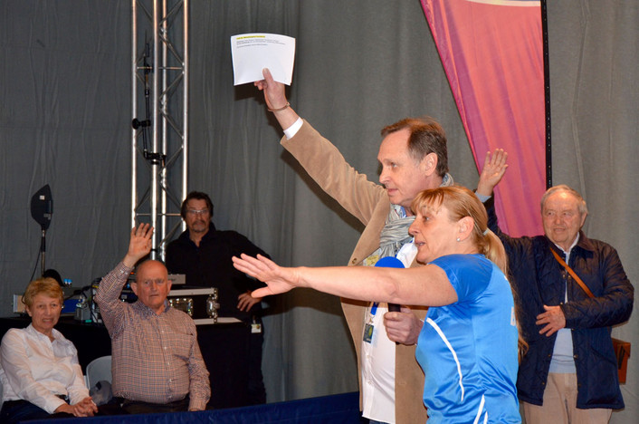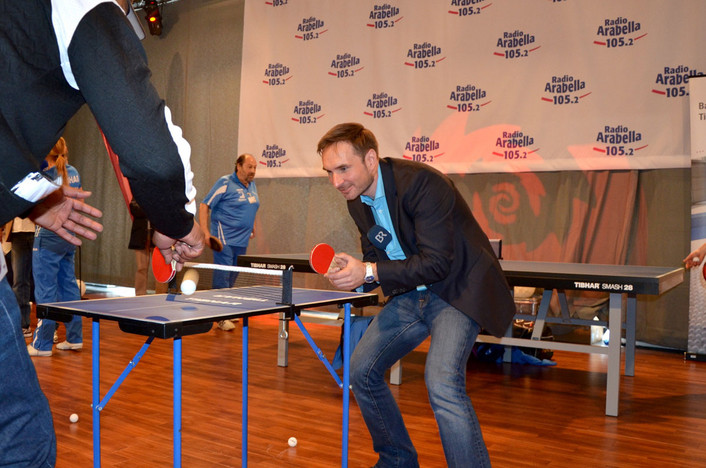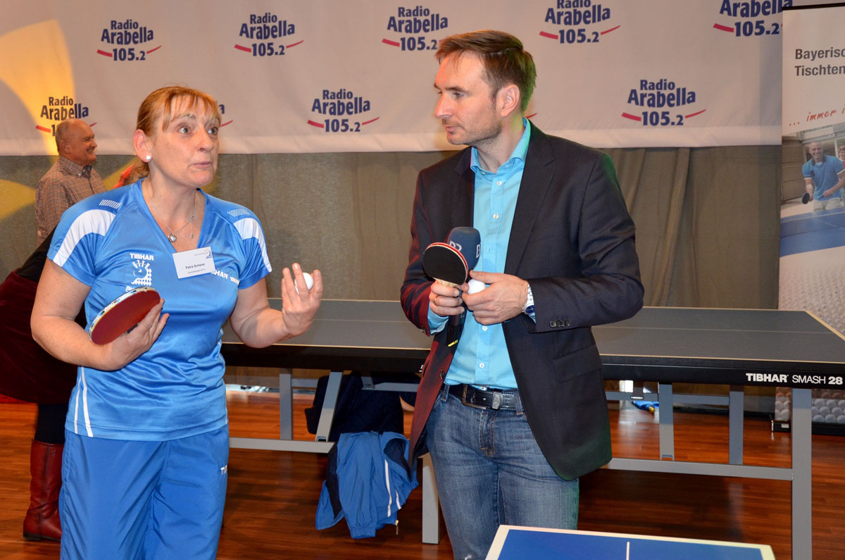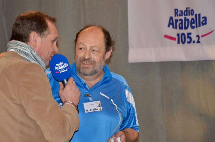 Moderiert von Klaus Schweiger (Radio Arabella) demonstrierten Karen Hellwig (TSV Schwabhausen) und Ehemann Michael Hellwig (Seniorenfachwart Oberbayern) bzw. Stefan Lazar (TSV Schleißheim) und Bernd Joelsohn (TSV Zorneding) die Grundschläge, parallel versuchten sich Besucher und prominente Zaungäste (u.a. Trompeter, Sänger und TV-Moderator Stefan Mross; unterstes Foto) auch selbst. Das Bayerische Fernsehen hielt die Kamera drauf und zeigte Ausschnitte am Freitagabend in der Abendschau.
