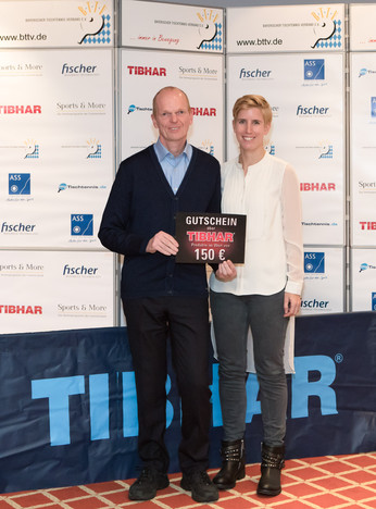 Gutschein für TT-Materialien aus dem TIBHAR-Sortiment im Wert von 150 Euro gestiftet von TIBHAR - überreicht durch Tibhar-Vertragsspielerin Kristin Silbereisen (amtierende Europameisterin im Doppel und Deutsche Meisterin im Einzel)