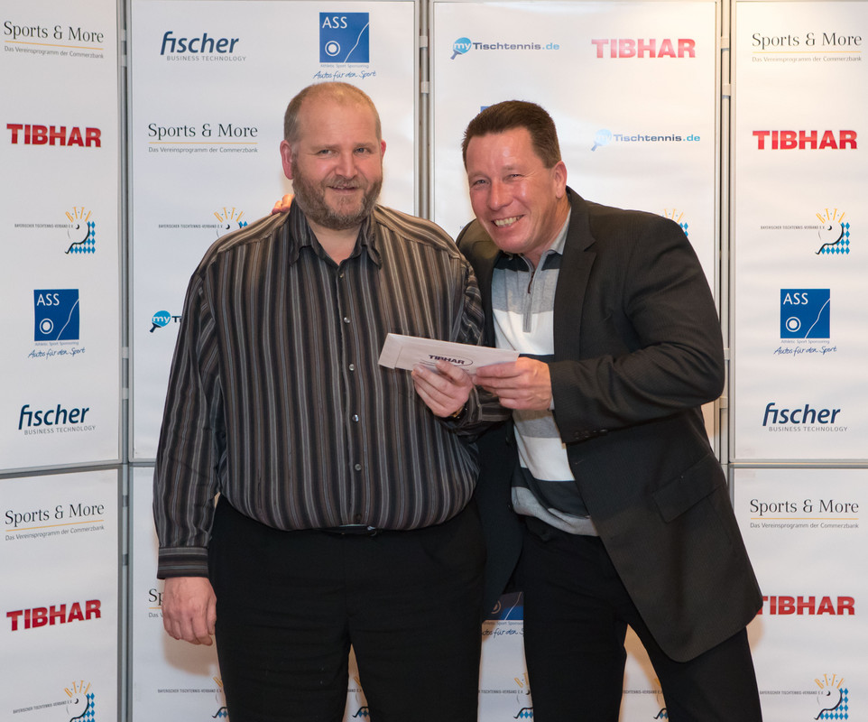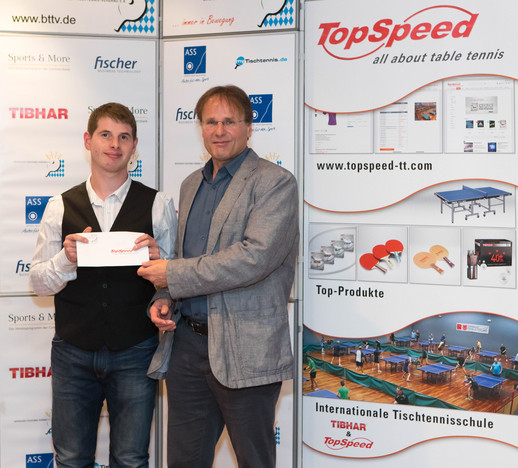 Gutschein für TT-Materialien aus dem TopSpeed-Katalog im Wert von 250 Euro gestiftet von TopSpeed - überreicht durch TopSpeed-Mitarbeiter Winfried Salzberger