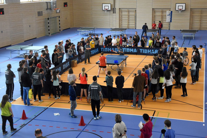 Kinder und Jugendliche feiern ausgelassen den Welt-Tischtennis-Tag: In der Sporthalle des Gymnasiums München Nord (Eliteschule des Sports) hat der Bayerische Tischtennis-Verband (BTTV) einen inklusiven Aktions-Nachmittag veranstaltet. 150 Schülerinnen und Schüler vom Gymnasium München Nord, der Balthasar-Neumann-Realschule, Kinder und Jugendliche von der Heilpädagogischen Tagesstätte „Aktion Sonnenschein“ und der Stiftung „Pfennigparade“ probierten gemeinsam Tischtennis in unterschiedlichen Facetten aus, spielten an großen und kleinen Tischen, gegen den Tischtennis-Roboter, mit normalen und mini-Schlägern, legten das Tischtennis-Sportabzeichen ab und versuchten sich im Rollstuhl-Tischtennis. „Das ist ein total neues Gefühl. Ich finde es gut, sich mal in die Lage von Menschen zu versetzen, die nicht gehen können. Gleichzeitig macht es auch richtig viel Spaß, im Rollstuhl Tischtennis zu spielen oder herumzufahren“, sagte Alexander (11 Jahre). Besonders beliebt bei den Schülern waren die leichten und wendigen „Sport-Rollis“.