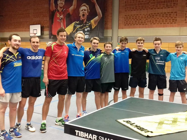 Großes Kino für große Talente: Einige der besten jungen Tischtennisspieler Bayerns waren Anfang November zu einigen Intensiv-Trainingseinheiten mit den Spitzenspielern des Zweitligisten TV Hilpoltstein, Alexander Flemming und Petr David, eingeladen. Mehrere Stunden lang ging es in der Hilpoltsteiner Stadthalle heiß her, der Schweiß floss zwar in Strömen, der Spaß bei allen war dennoch enorm. Das Bild zeigt von links die Trainer Christoph Weinhold (DJK SB Versbach), Jaka Golavsek, Petr David, Alexander Flemming (alle TV Hilpoltstein) sowie die Talente Daniel Rinderer (Bayern München), Matthias Danzer, Hannes Hörmann (beide TV Hilpoltstein), Petros Sampakidis (TuS Fürstenfeldbruck), Sebasian Hegenberger (TV Hilpoltstein) und Niclas Reindl (TB/ASV Regenstauf).