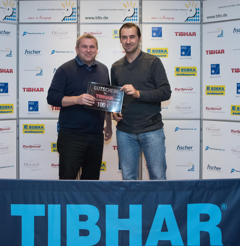 Gutschein für Tischtennis-Materialien aus dem TIBHAR-Sortiment im Wert von 100 Euro, gestiftet von TIBHAR - Stellvertr. überreicht durch TopSpeed -Geschäftsführer Bobo Pranjkovic