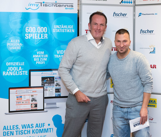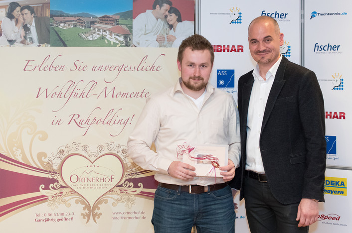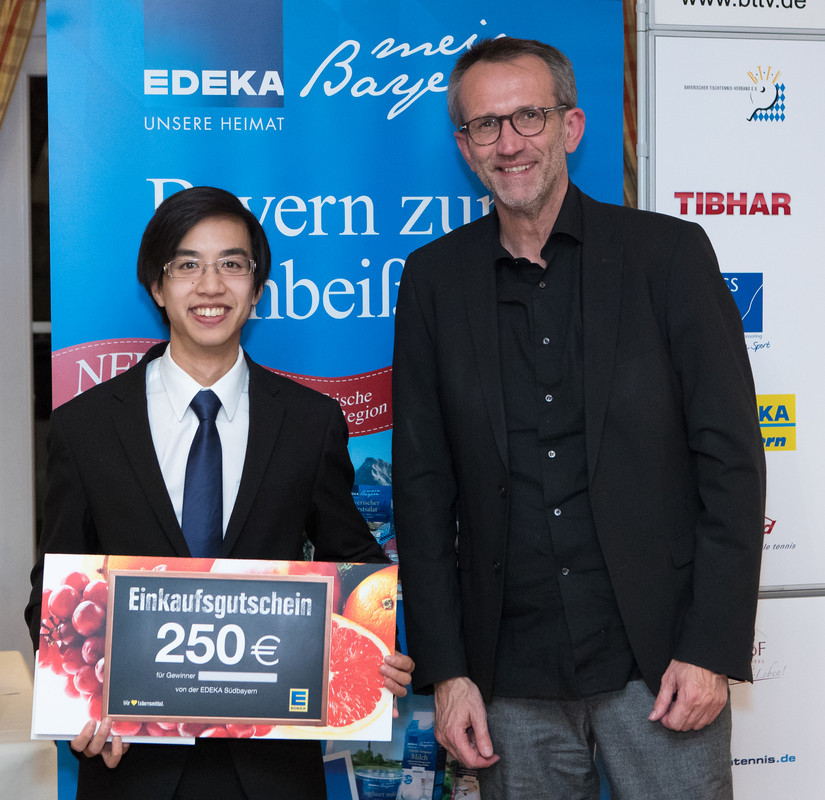Gutschein von myTischtennis für einen myTischtennis-Partner sowie ein 10-jähriges Premium-Abo im Wert von 220 Euro, gestiftet von myTischtennis - überreicht durch Geschäftsführer Jochen Lang