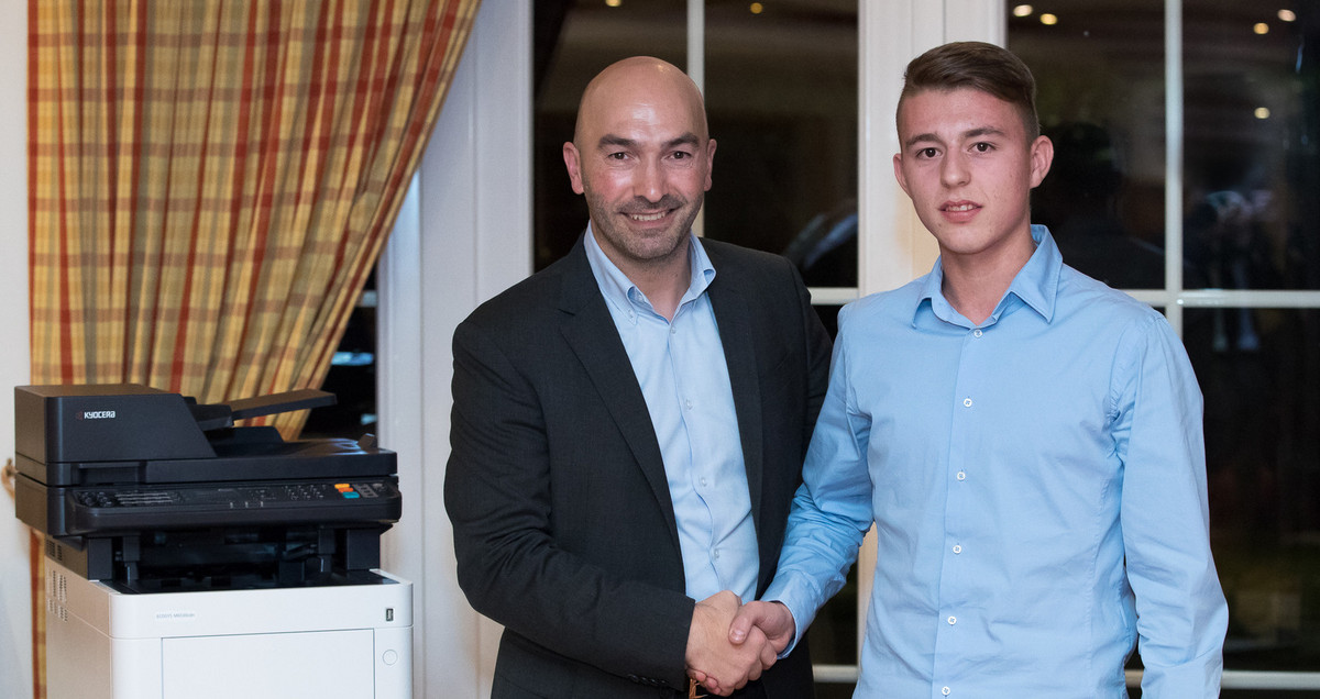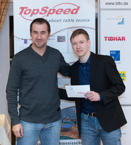 Gutschein für TT-Materialien aus dem TopSpeed-Katalog im Wert von 250 Euro, gestiftet von TopSpeed - überreicht durch Geschäftsführer Bobo Pranjkovic